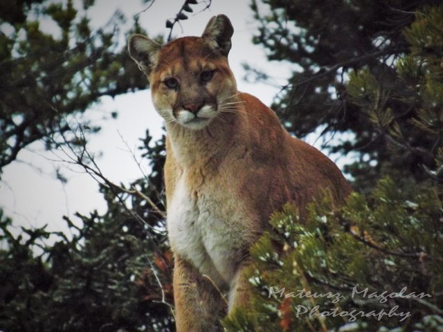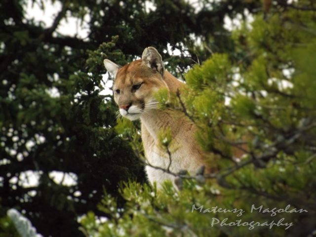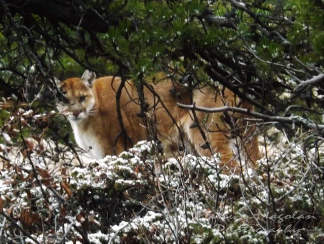 Tuesday this week, while out alone looking for a Mule Doe, I had an amazing encounter with a cougar! While working my way down a ridge, I sat down to take a break, and something growled right next to me, I turned my head, and a cougar was standing 30 feet from me. I'm not sure if he was stalking me, or if I walked in on him.. but here we were staring at each other far closer together than I would like. I slowly stood up pointing my rifle at him one handed, and got my bear spray off my hip with the other hand. He eyed me up for about 10 minutes right in that spot before he decided I wasn't worth the fight and settled down. His fur relaxed, and he lowered his shoulders, and just sat down and started looking around completely unconcerned with me. That's when I took the opportunity to crouch down, set my rifle in my lap and take out my camera!