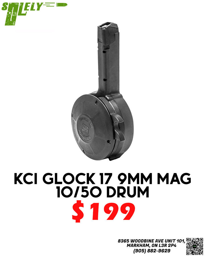 KCI Glock 9mm 50rd. Drum Magazine. This black drum magazine features a durable polycarbonate body and leaf magazine spring. Easy to load, the magazine is compatible with Glock G17, G18, G19, G26 and G34 Gen2 model pistols chambered in 9mm Luger as well as the AR-9 and carbines that accept Glock 9mm mags. Made in Korea this drum magazine has a 50 round capacity and comes with a limited lifetime warranty through KCI USA. It is KCI's goal to provide an exceptional level of quality in every magazine they make.