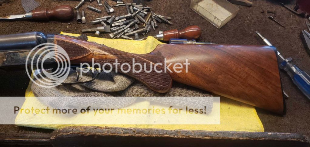Got some of the latest pictures in from Mr Dawe. There are a few coats of oil left to be applied but for all intents and purposes, the rehab of the action and the full restock are now completed. And, IMHO it's looking pretty damn good. The only thing left to complete the picture is properly redone black and white Damascus barrels (Oh my, it will be gaudy!). I had planned to leave those aside for the time being but I got a call from Mr Dawe a few weeks ago and he pointed out to me the error of my ways......barrels must be done now. He actually said "You haven't looked at them for a while.....they look like crap!"