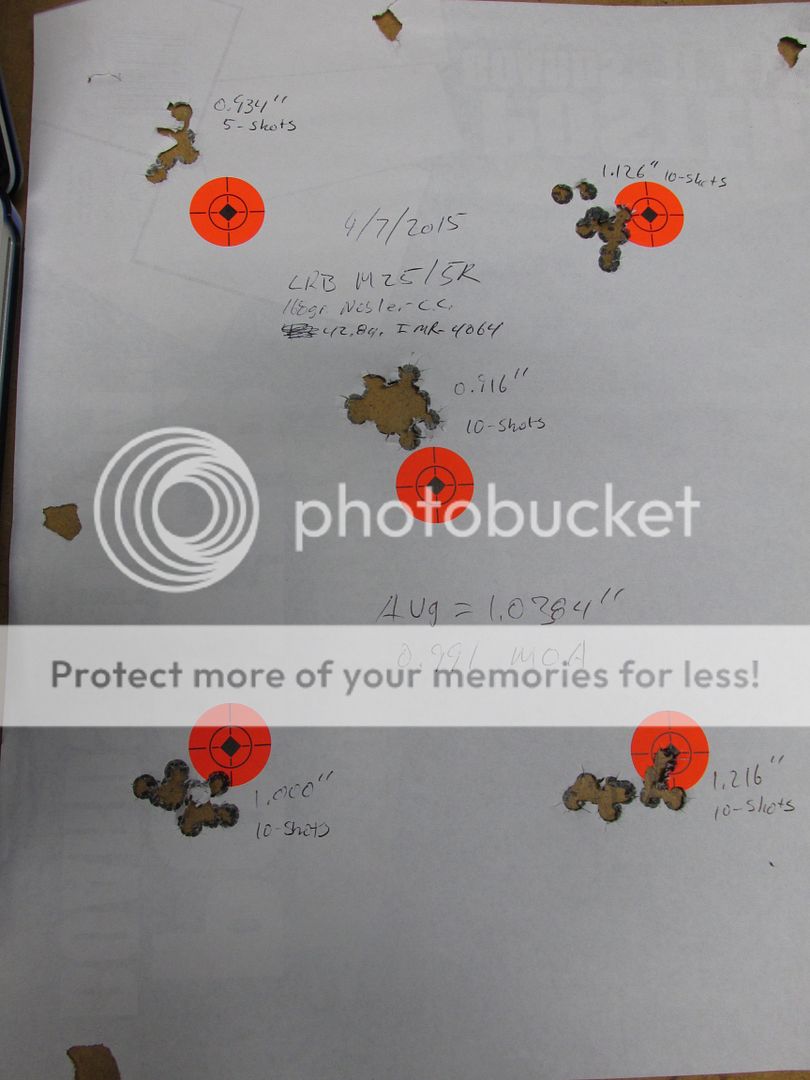 For anyone who's curious, the rifle is a 22" M305 with all the usual tweaks done, as well as a NM style oprod spring guide, USGI gas system, SAI muzzle brake, bedded in one of 45ACPKing's stocks. ARMS 18 scope mount with a Leupold Mark IV 3.5-10x40 in ARMS 22 rings. The load was 168gr Hornady HPBT Match over 40.3 gr of Benchmark in Fed cases with CCI 200 primers.