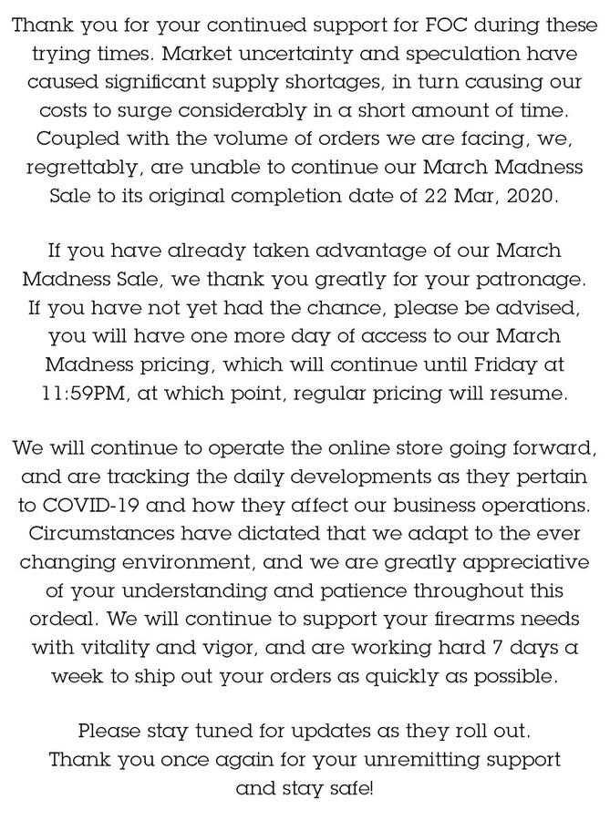 Firearms Outlet Canada CGN frequent flyer Business Member Rating - 100% 27 0 0 Location Ajax, ON Mar 19, 2020 #1 Sales Ends Friday March 20th At Midnight. Click Here To Shop Clearance! Attachments CGN-POST3-01_01.jpg 111.5 KB · Views: 490 CGN-POST3-01_02.jpg 134.3 KB · Views: 480 CGN-POST3-01_03.jpg 52.3 KB · Views: 479 CGN-POST3-01_04.jpg 85.5 KB · Views: 481 CGN-POST3-01_05.jpg 48.8 KB · Views: 481