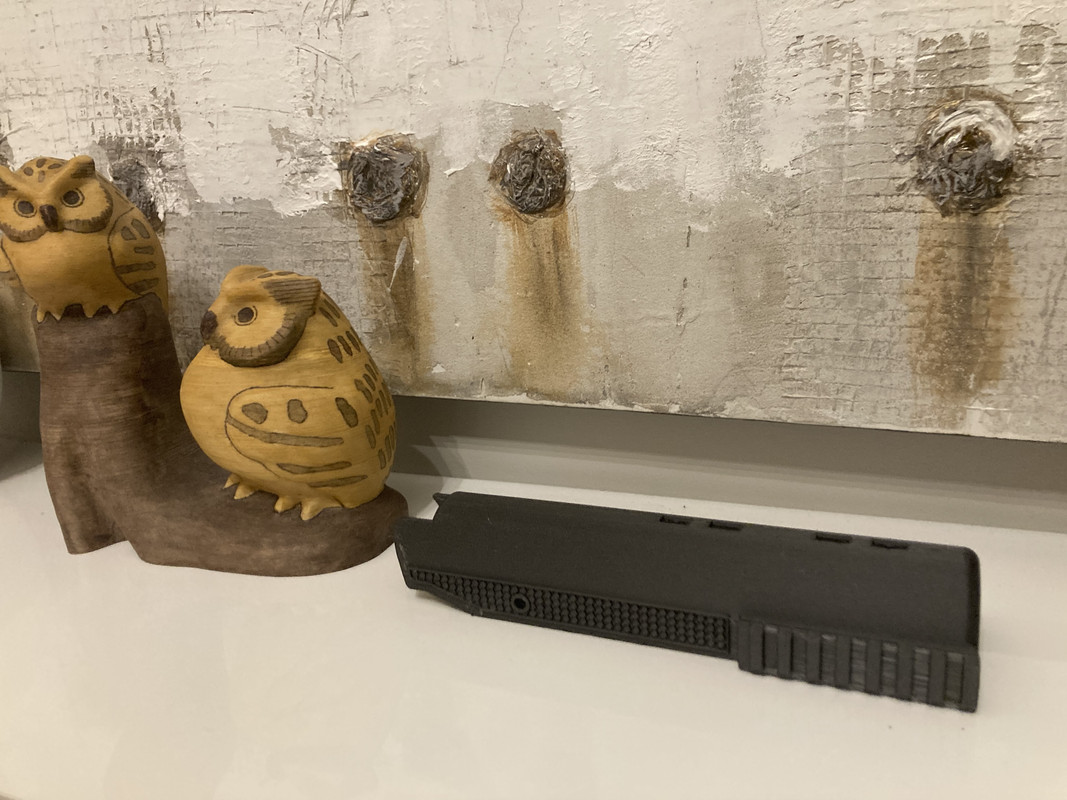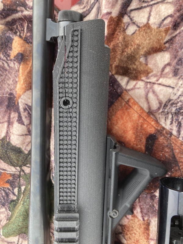 The fore stock was performing perfectly. It chewed through all the 2 3/4” shells I could throw at it. She ate the 2 3/4” buckshot and slugs no problem. Then came the 3” Magnum buckshot. The CF-PLA decided to split, right where the action bars attach to the stock. Damn thing blew one of my pins out into the snow, yea that’s a goner. The other pin was stuck in the plastic. I’m thinking 12g > CF-PLA at this point. Video will be posted to Twitter.