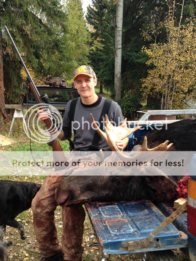 The area that we hunt is so heavily brushed that the only access you have is by road or jet boat. After a week of trying to track down a moose and 3 really close encounters with bulls I saw but never got a shot at, I finally caught a bull out in the open. As I was lining up on him he started to walk towards me, so i figured I would close the distance. At about 30 yards he turned broad side and let a big snort out. Right at that moment I thought this is a bad idea. I backed off a few steps and placed my shot right at the top of the neck and down he went. Now for the fun part... I manged to get it in the truck by myself. A ran a long cable out to bull and dragged it out to the road as it was too far. I dressed it and quartered the hind, the front was just to much to split. I could dead lift the head and hind quarters in to the truck but after that there was no way in hell the front were getting in there. There was a steep bank on one side of the road with about a 6" tree growing out of if where all this was going on so.... I wrapped the cable around the front feet then ran it around the tree on the bank and back to the truck. I pulled the front up the bank until it hit the tree, then i tied it off with a rope and unhooked my trusty cable. I then backed the truck into the ditch right under the tree. I cut the rope and the front half rolled right into the box. Two hours after the shot I had the truck loaded up and headed for home. Where there is a will there is a way, and I will always carry a long piece of cable in the truck from now on. I don't think I have ever had such a work out in my whole life. Fortune was definitely shining on me that late September morning.