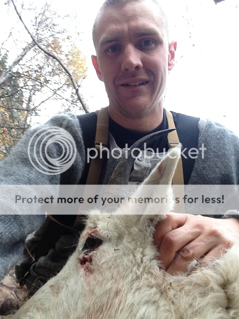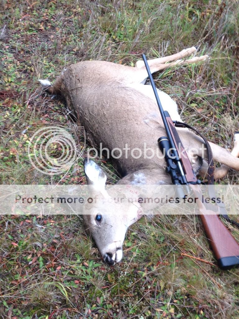 With half a moose in the freezer I figured i could relax and really enjoy some deer hunting. This year they opened a whitetail doe season as well as a buck season on mule and whitetail. So I took my rattling antlers out to a semi treed meadow and hunkered down. After rattling for about a min, I seen some movement in the trees about 50 yards out but couldn't make out what it was. I kept at it for a while longer but nothing came in. I figured i had nothing to loose so I left my gear where it was and with just my rifle in hand i started still hunting where I figured the deer might be if there was one. Sure enough I spot a doe about 70 yards out, frozen still just starring at me. The grass about 3 feet tall so I to move about 15 feet to where it was a little shorter. I was shaking pretty good so I had to calm myself down and take a few deep breaths. From a kneeling position I was still too shaky, so I sat on my but and placed my elbows on my knees... much better. I lined up right on the white patch on her neck and squeezed off a perfect shot. Another nice clean kill and no meat damage. There was more fat on her than any buck I have ever killed, it kinda surprised me.
