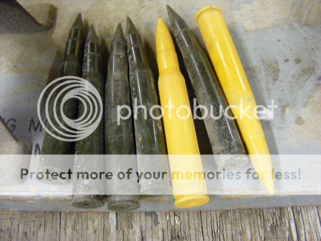 7 rounds of oversize 30-06 dummy ammunition came with them. I guess I'll have to sew some cargo strapping to make a cloth belt. These dwarf the normal 50 cal stuff (of which I hammered off 100 rounds last weekend, but that is another story).