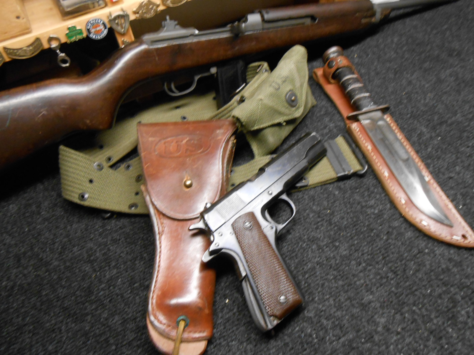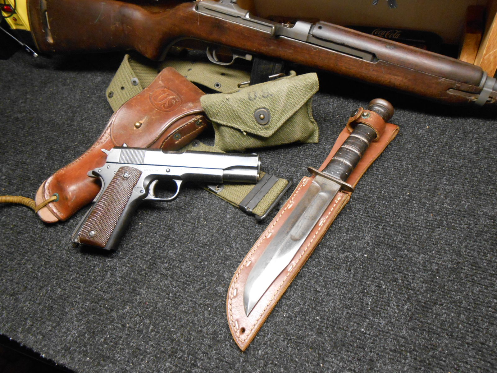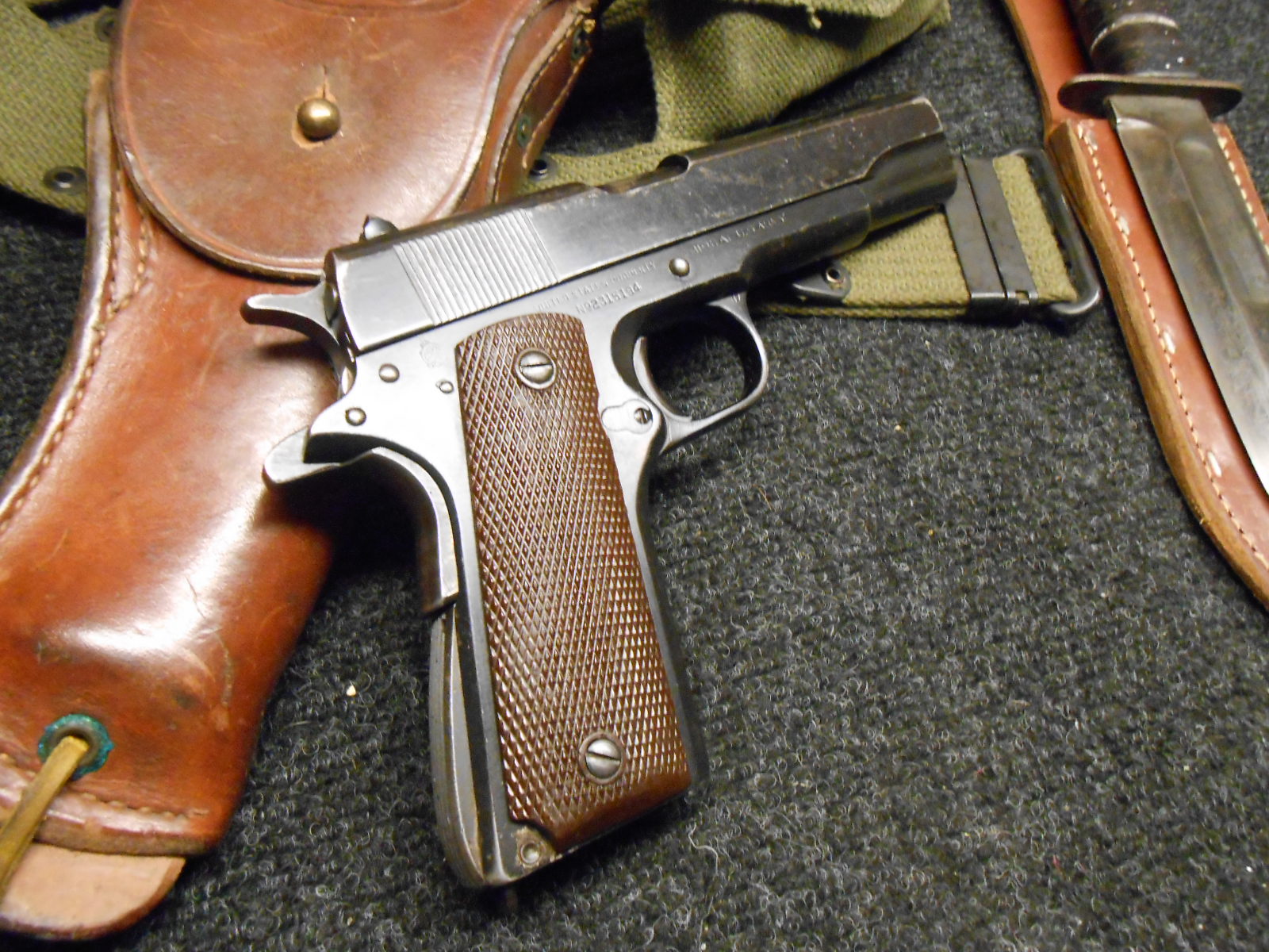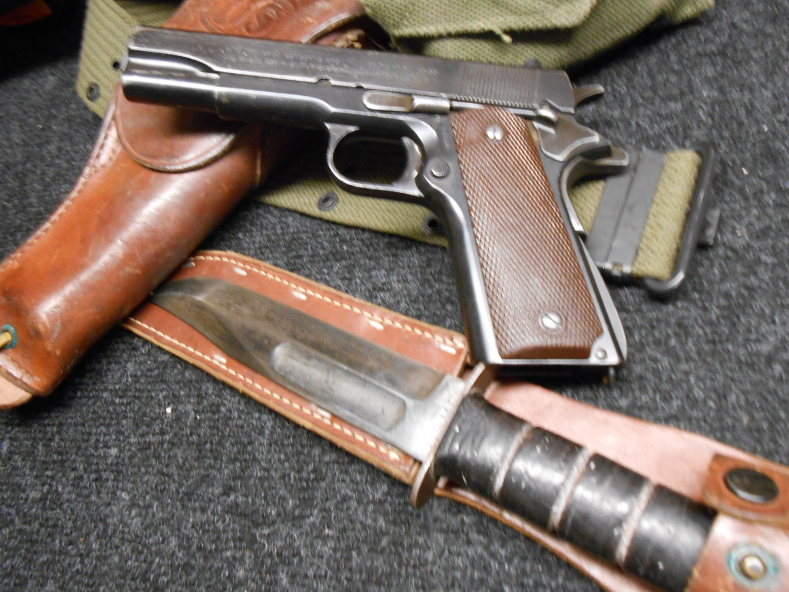 I have been trying to show you guys some of my early stuff..I have lots and it has taken me a year to figure out how to add pictures..App I suck at photography..So I am just posting this to see what it looks like..My 1945 1911 45..My 30 cal Underwood and a nice Ka-bar with Holster and Battle Belt..I will get the wife to take some nice pictures of other stuff I have from very early Inglis to Big Garands...Thanks for looking and comment good or not good are always welcome..I hope you can see the pictures.