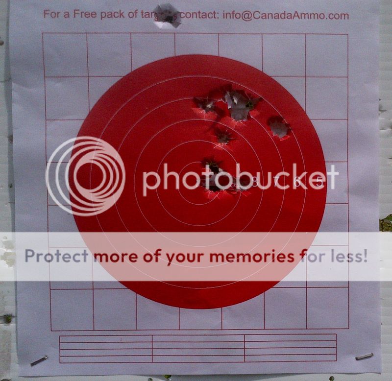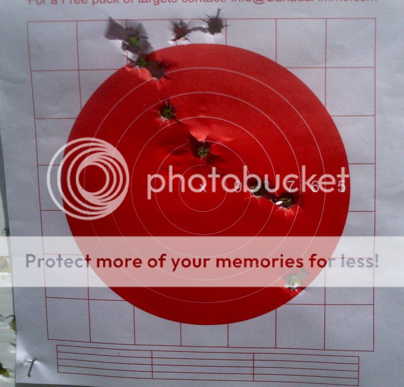 To compare, here are ten shots at 10 meters with my Norinco 1911 (the CanadaAmmo deal one). I find this gun a bit big for my hands, I have a hard time getting a comfortable grip on it. (That's my excuse!)