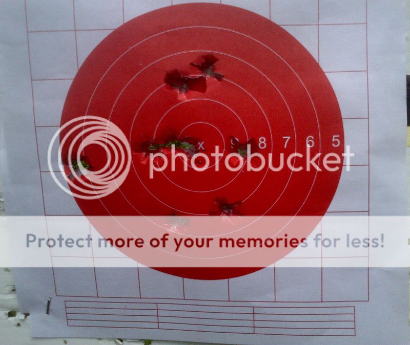 Here is a 10-shot group, at 10 meters, with every shot fired double action (wanted to practice my DA). Notice one "flyer" up in the top... oops. My fault.