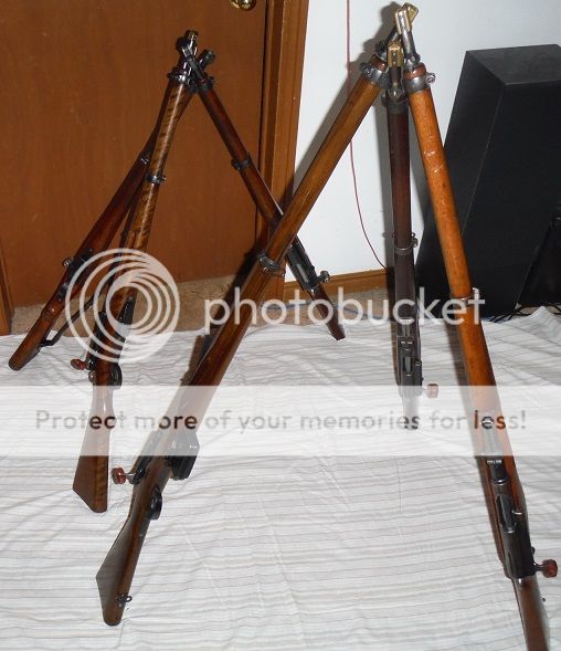 Here is a photo of some Swiss Rifles in Pile Arms. First group consists of a I.G. 1889, I.G. 96/11, and a I.G. 1911. Second group consists of two K31s and a K11.