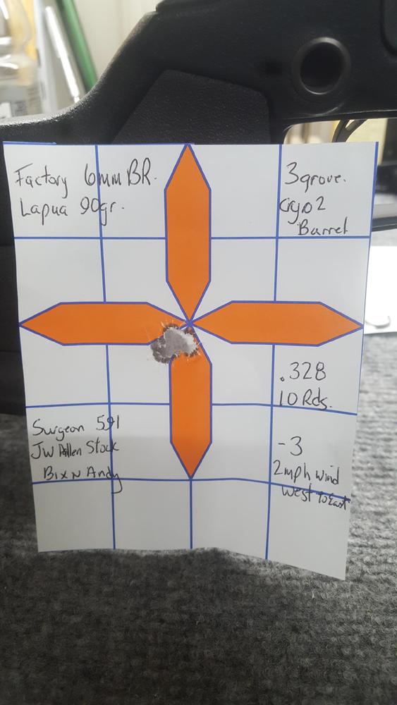 We spun up a 6mmBR on a Cryo'd 3 groove barrel on a Surgeon 591 in a Chassis stock....these barrels are gonna be good!!!!!: