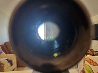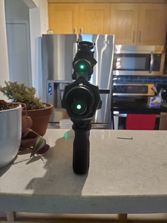 In the first pics the elevation is adjusted fully up. In the last pic the elevation is adjusted fully down. I have intentionally offset the windage and the elevation slightly for the green dot. Top greendot is the bore site, bottom is the green dot.