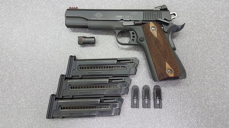 So I was cleaning out my safe, can't find stuff anymore, and came across 2 guns I just never use. The first is a GSG 1911 that I bought my wife to teach her to shoot. It has about 300 rounds down the pipe and comes with 3 mags (w/Dlask Arms aluminum base pads), thread adapter, Dlask Arms fully adjustable sights and the factory base pads, everything in the picture. (I think I also have a GSG spare parts kit somewhere too but I can't promise..) Asking $430 shipped anywhere in Canada.