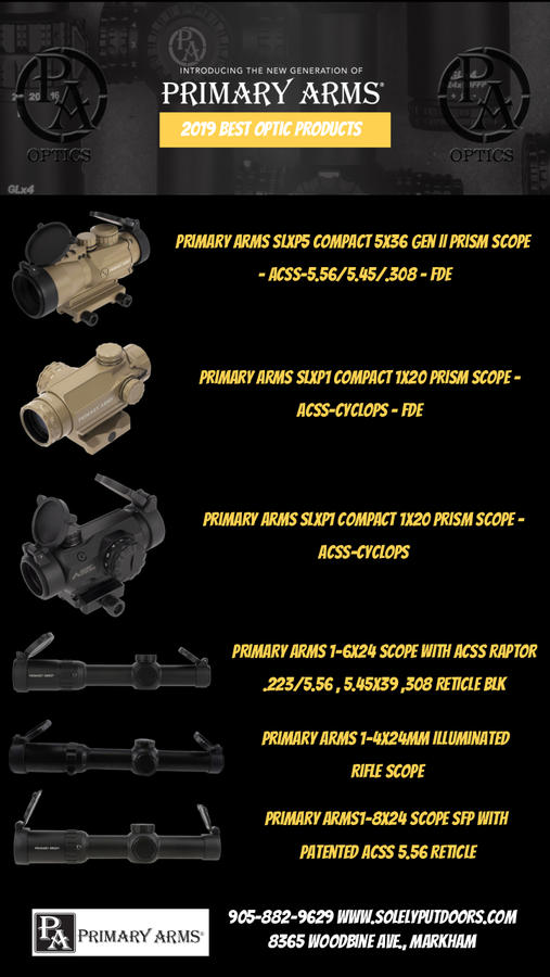SolelyOutdoors CGN Regular Business Member Rating - 100% 9 0 0 Location 44 Riviera Dr L3R 5M1 Markham, ON Oct 18, 2019 #1 Attachments primary arms scope.jpg 71.8 KB · Views: 498 optic.jpg 72 KB · Views: 499 red dot.jpg 79.2 KB · Views: 502