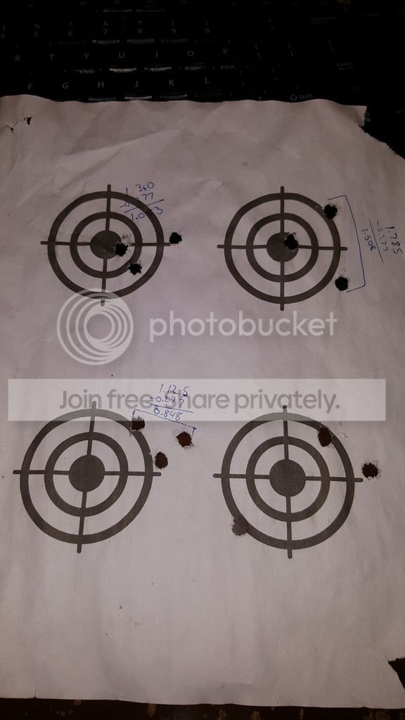 My rest wasn't as good as last time (the range was kinda busy so hunks of wood for the front rest were in short supply) but I did manage another sub-moa group at 0.848 inches, and another at 1.083", the rest were 1.27, 1.35, and 1.5 inches. One group was too crappy to even bother measuring, it was well over 2" but I know I pulled one shot.