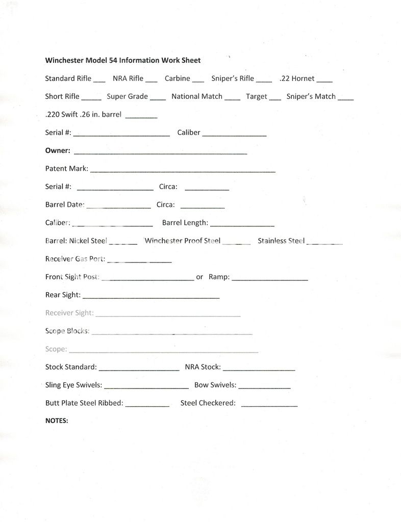 A Gentleman who belongs to the Winchester Arms Collectors Association is writing a book on the Model 54 and he would appreciate the information on as many rifles as possible. He can be contacted by Email: davidbichrest@hotmail.com