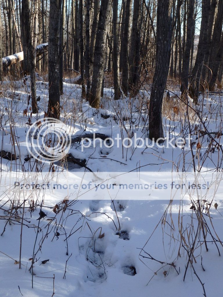 The Fourth morning of my hunt started out a bit of a gong show. Driving into the spot I had intended to hunt I noticed a nice buck track crossing the road. It was the best track I'd seen so far so I stopped to look at it. There was a dusting of snow in the bottom of the track which meant it had been made early the previous morning... too old. Still it was a nice track, maybe it would be possible to catch up, I hemmed and hawed it over, followed the track a little, and eventually decided to move on. The delay meant I got to my starting point a bit late... only to find the logging road I was intending to use to get into some ridges had been completely rototilled by the logging company!! I don't mind when they shred the road, keeps a lot of hunters out, but I now had about a mile of shredded road and slash to walk over! If I shot something back there the drag out was going to be brutal. Then I realised I had forgotten my hunting jacket, no biggie, I had a warm sweater in my pack, but not being able to tuck my bino's down the front of my jacket was going to be pretty annoying. I hadn't used them once the previous day so I decided to leave them behind. I buckled on my belt pack, shoved a micky bottle of water and a can of sardines in my pocket, and stuck a primer on my Hawken... about halfway in I realised I had left my touque at the truck. Efff it, I could put up with a whole day in freezing weather with only a baseball cap, hopefully!