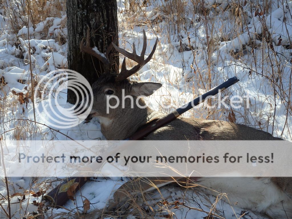 It was slow going over that tore up road. I finally reached the trail that lead up to my ridge, on my way through a cutblock I found a decent track, it wasn't huge but the side to side offset was pretty good, and its maker dragged his toes pretty regularly in the couple inches of snow... better yet it was smokin' fresh! The track lead up onto the ridge and down what had been a heavily used scrape line the year before, with this year's late snow though any rut sign was depressingly absent. I was moving pretty slow, almost still hunting, the track was super fresh and it wasn't big enough that I was overly concerned with whether I caught up with its owner or not. I was standing by a scraggly pine looking through the timber when I heard something to my left... and there he was! About 30 yards away, he somehow had no idea I was there so I had some time to work with. I counted ten points on his somewhat un-inspiring rack, cocked the Hawken and raised it to my shoulder. I had turned down bucks better than this early in the season, what was different now? With over 20 miles of hiking in the last few days, leaving the truck before daylight and returning after dark, stopping just long enough to much on a meager lunch... now I had earned him. Now I had a great hunt under my belt that deserved to be consummated, and as far as I'm concerned any half decent timber buck tracked to within 30 yards and killed with a traditional muzzle loader is a trophy. I settled the bead behind his shoulder and pulled the trigger.