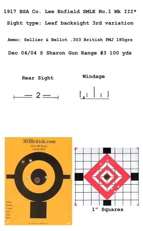 She owns a beautiful all original BSA Co.(1917) No.1 MkIII* (all matching numbers), including the rear sight. It even has the spring loaded Flanders muzzle mud flap mounted on it. She took it out to the range and was reasonably happy with her first "zeroing" go round at 100 yards. Here's the range report she put in her "data book" for this particular gun.