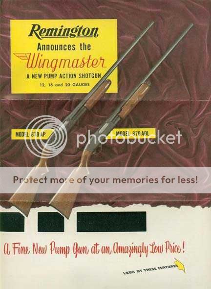 Some where in my basement there is a tote with all of my original remington sales broucheurs from 1950 to I think about 2004 when I stopped. They got buried with tons of other stuff when we had to do a room over back there. I just started last week opening some when I was selling off some reloading gear for a friend. Totes of 870 & 1100 parts, stocks you name it. And if you think I am full of crap. I think there is still more working wingmasters than I have fingers and toes still in my herd. I just make them work and never cared what year the part came from since it would fit even if it had to be an assembly and honestly didnot care if it was a little different individually