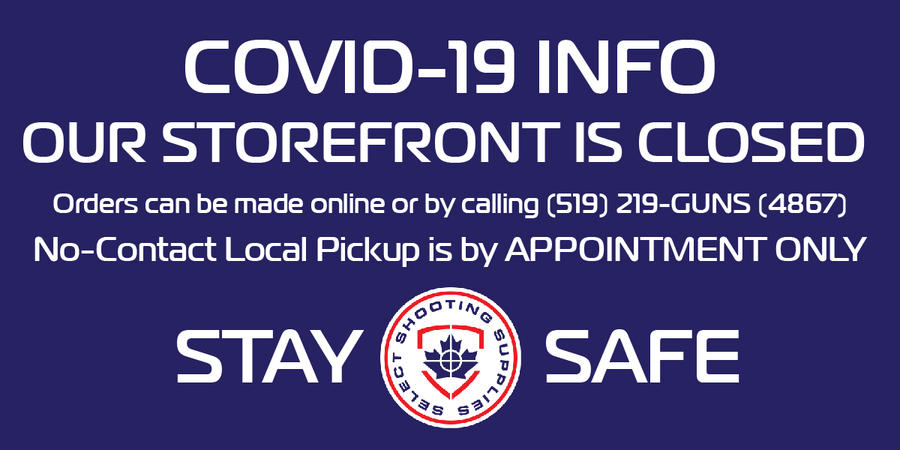 We continue to ship items ordered online on www.selectshootingsupplies.com and take phone orders for items we don't ship at present time (ammunition, primers, powder) that are available for pickup via our no-contact pickup method in the vestibule of our new location that is disinfected after each transaction. Call (519) 219-GUNS (4867) to place a phone order and make a pickup appointment.