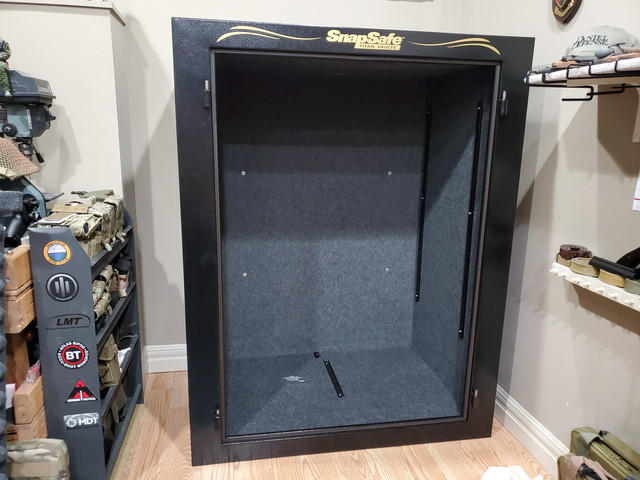 The interior panels lend the safe's inner surfaces a very professional finished appearance. The internal dividers are such that sufficient panels are provided to complete several different layouts depending on the owner's desires. I opted for maximum rifle storage, which is rated to accommodate 56 long-guns without optics, somewhat fewer if scope-equipped. The long top shelf should accommodate all of my handguns quite nicely. I was able to re-purpose my steel cabinets into stacked, lockable ammunition storage, thus killing 2 birds with one stone (or in this case, one safe). When all was said and done, the Snap-Safe Titan XXL Double-Door Gun Safe was $4300 and change CAD, delivered to my home in the vicinity of Edmonton, Alberta.