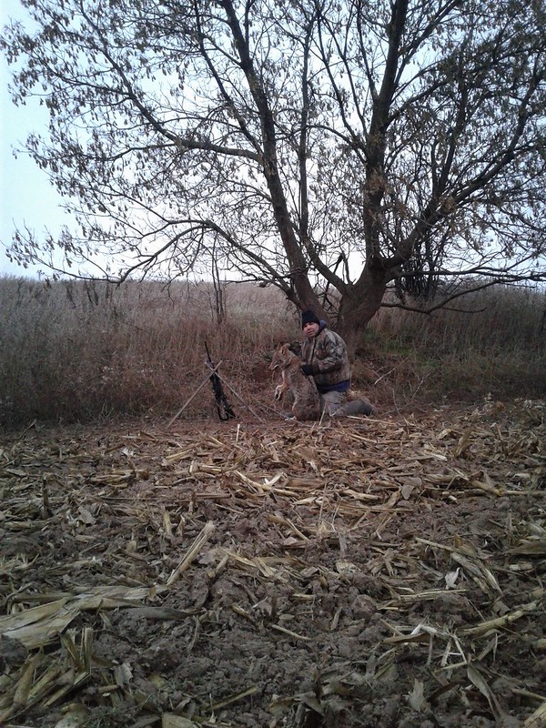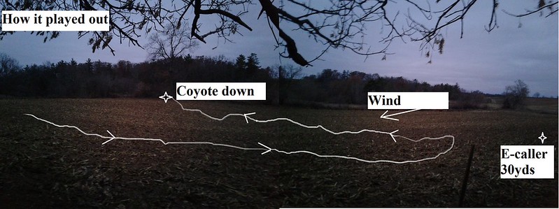 I setup the ecaller about 30 yds to my right. Went to sit under the tree, got comfortable and began the calling sequence…. The dying rabbit sound didn’t play 30 seconds before I see a flash/blurr right in front of me, (caught me totally by surprise-she was moving really fast) . Seems like there was no time to think……instinct takes over…..