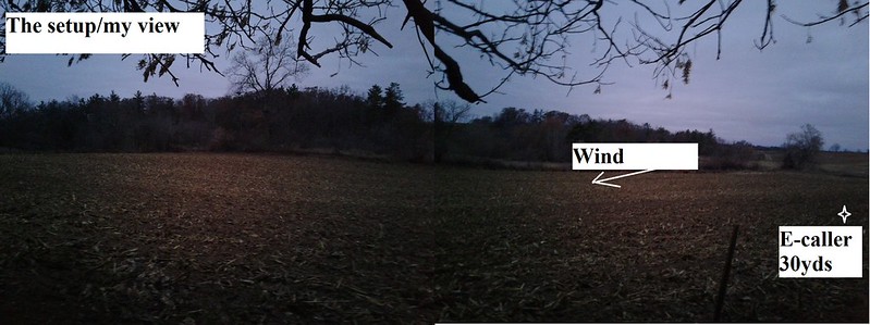 I setup the ecaller about 30 yds to my right. Went to sit under the tree, got comfortable and began the calling sequence…. The dying rabbit sound didn’t play 30 seconds before I see a flash/blurr right in front of me, (caught me totally by surprise-she was moving really fast) . Seems like there was no time to think……instinct takes over…..