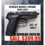 We will be putting on our Canadian Exclusive Stoeger Cougar 8000 on the second day of our December Christmas Sale December 14th for $399.99!! These guns come with two 9rd magazines, cable lock, and owners manual/warranty papers. They use a operating system similar to both a Beretta 92FS and a Beretta Px4 Storm. For more information of the up coming sale, click HERE