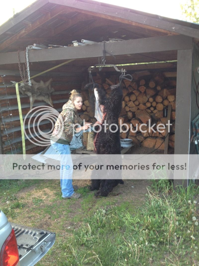 We hiked up to it. I go one way and Megan goes the other. Like I said the bush was very thick. Also where the bear headed in was very steep. I look over to Megan to say "can you see anything" I see the rifle is shoulderd and before the words came out of my mouth she squeezed one off.