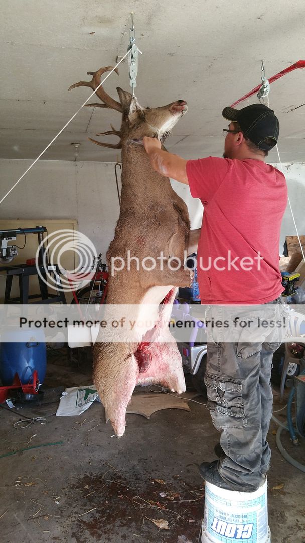 well, at 9:42 AM this morning the good lord pointed the way to a very thankful gift to this family of ours and Lady Luck was along with us as well, as the one shot was lethal! My oldest Jr took down a fine buck with his new Ruger American Compact in 7mm-08 with one my Leupold scopes on it. His rifle does not like our usual Hornady Performance ammo, so he was using the Hornady American White tail ammo. Pics to follow. He usually goes with great success a head shot, but on this one occasion he chose a vitals shot due to the circumstances at the time (bush twigs). Shown will be the buck and the shooter (most of him) and the rifle and my youngest Jr, our fastest man with a knife. He is standing on the same 20L pail that he uses to kiss his girl friend. The carcass has been cooled off with the garden hose and hung and skinned. The key to the winter hotel (attached garage) has been laid out for the weasels to move in for the winter (hide, feet & fat trimmings). We are just waiting a few hrs for the meat to cool down a little more and stiffen up some. Yep, the celebration has started, the Bar is open, wide open! Come-on over! The kitchen table is prept with the cutting boards and stainless steel buckets and the meat grinder is ready along with the vac-packer and the knives have a razor edge on them. The yote scrap pail has yet to be located. It's gonna be (pounded, sorry) back straps rolled in corn flake crumbs fried in a cast ironpan and served with A-1 sauce for supper tonight and I just know I'm gonna have very thin sliced quick fry for lunch tomorrow (cast iron pan, butter and salt and pepper). Very thick antlers for around these parts. He's my kind of buck, shows bruises from hard knox fighting! Has damage on his face around his left eye from fighting. He was a champ!