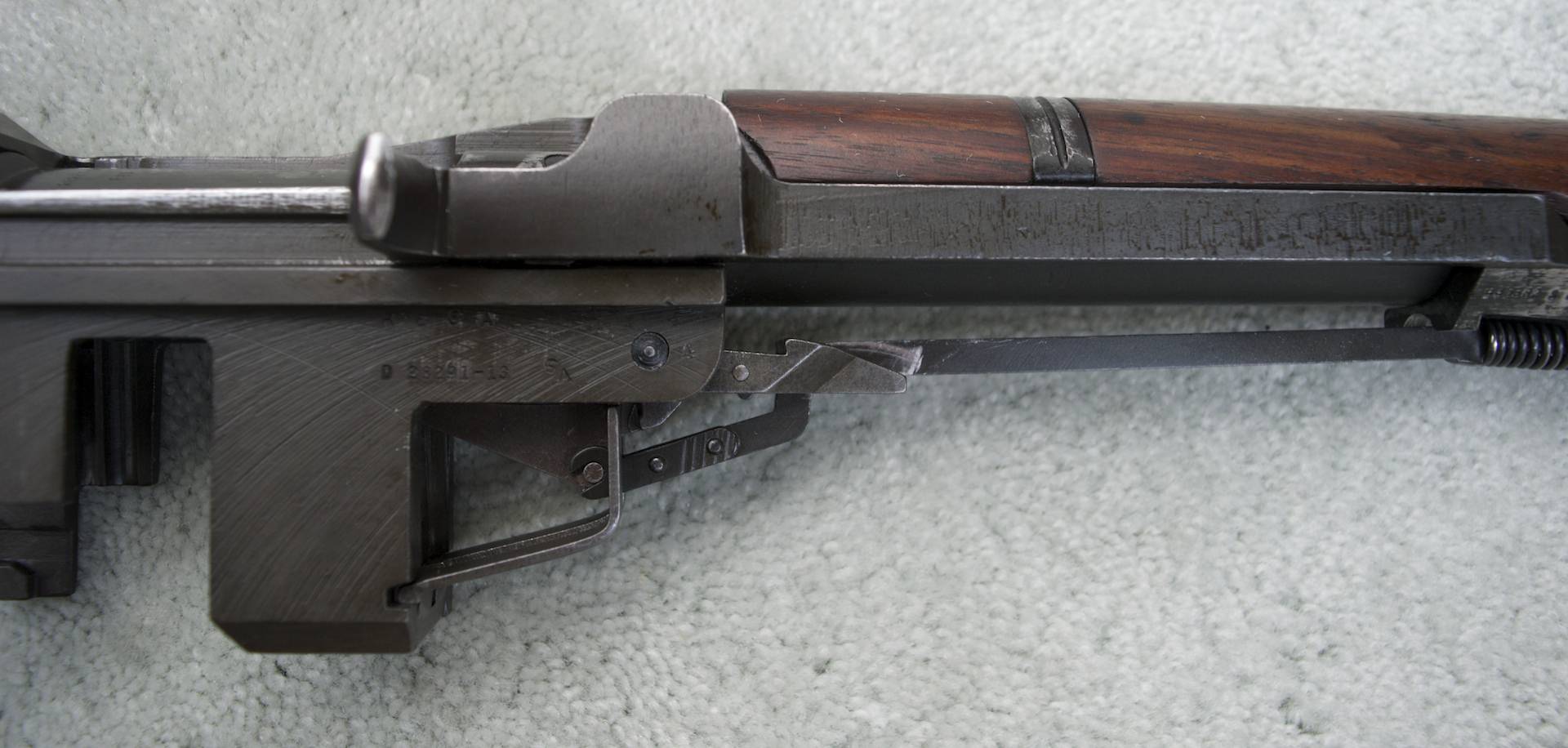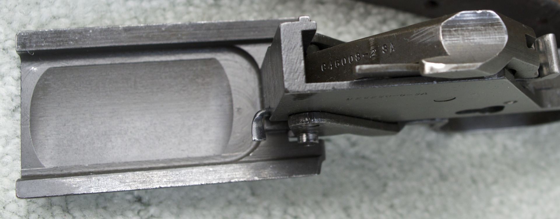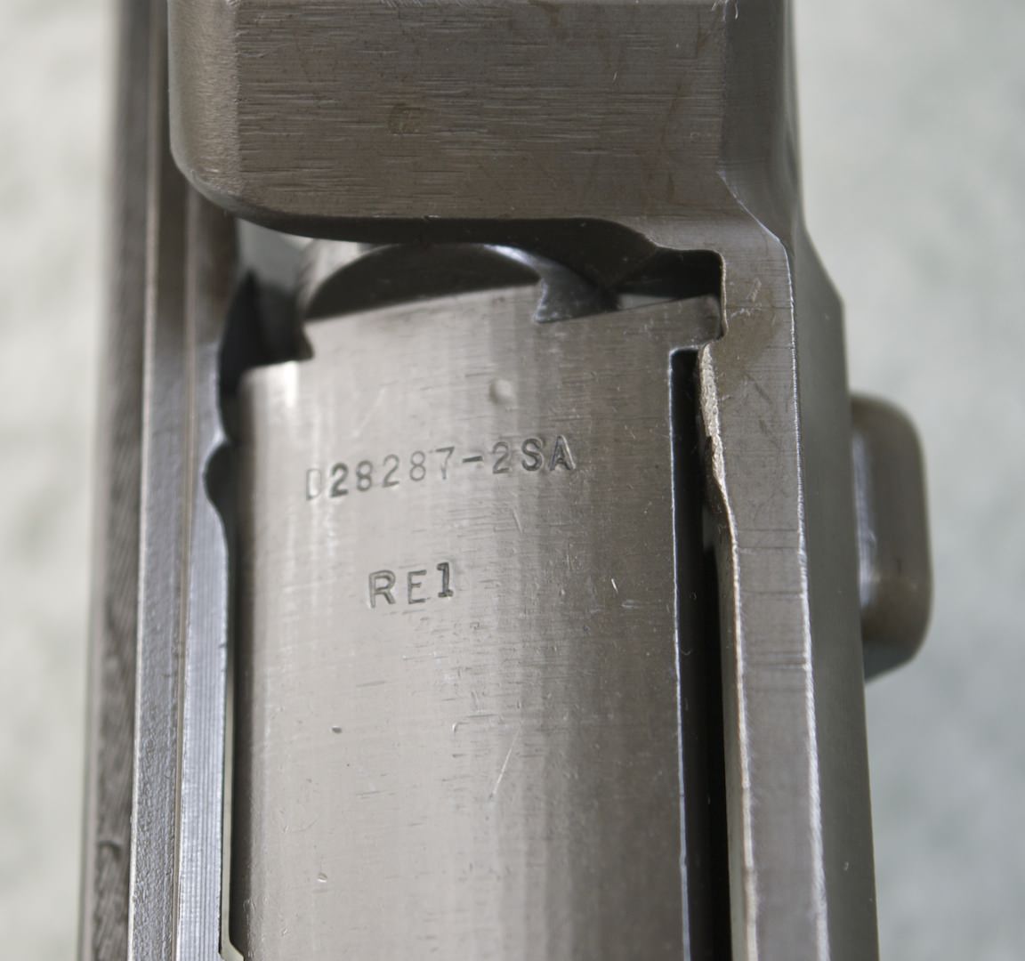 The next few interesting bits are the short pinion flush nut rear sight assembly, with checkered elevation knob (this pre-dates lock bar sights). The half rounded firing pin in the 2 SA bolt, the uncut 3SA operating rod, grooved rear hand guard clip, narrow base gas cylinder with front sight seal intact and early trigger guard with drawing numbers.