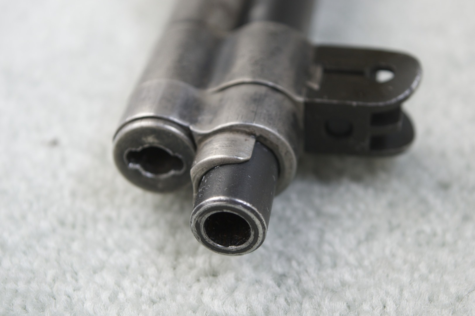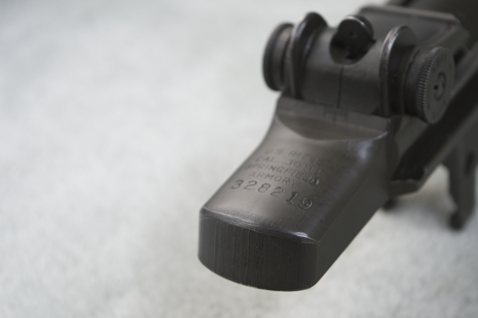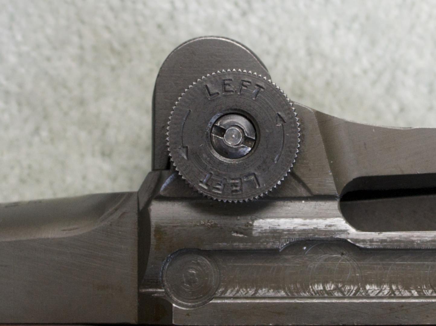 The next few interesting bits are the short pinion flush nut rear sight assembly, with checkered elevation knob (this pre-dates lock bar sights). The half rounded firing pin in the 2 SA bolt, the uncut 3SA operating rod, grooved rear hand guard clip, narrow base gas cylinder with front sight seal intact and early trigger guard with drawing numbers.
