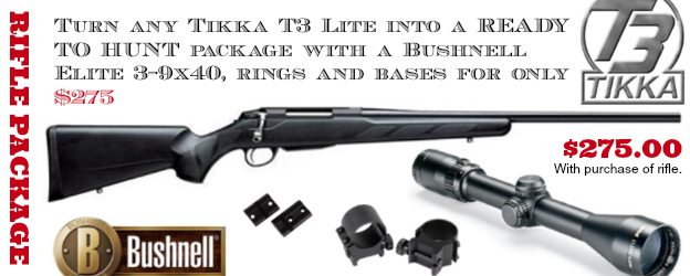 If you have been looking to put together a new rifle setup. We are currently offering a Bushnell Elite 3-9x40mm with rings and bases for $275 which includes our gunsmith mounting and bore-sighting it for you. With the purchase of any Tikka T3.