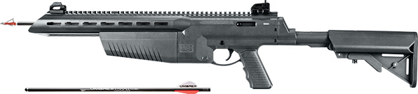 The Umarex AirJavelin is a new way to shoot arrows. Powered by CO2, the Umarex Air Javelin launches a 170-grain air bolt at 300 fps. The AirJavelin takes airpower into a new direction with 34-foot pounds of energy delivered via Straight Flight Technology arrows. Shooters can line up the target with the installed open sights or zero in a dot sight or scope for pin-point arrow placement. The AirJavelin has a full-length Picatinny rail on the top along with a short section below the barrel. Both sides of the AirJavelin's stock are also equipped with M-LOK slots. The AirJavelin accepts 88-gram CO2 tanks and will launch dozens of arrows downrange on a single tank. The Umarex 2x12g CO2 adapter (not included) will also install on the AirJavelin handy for shorter shooting sessions. Lightweight and versatile, the Umarex AirJavelin is more than a new way to shoot arrows, it is a great way to open up archery fun for the whole family.