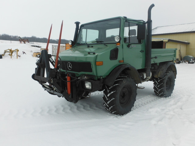 2001 Unimog U1400AG, full agricultural specification. Front and rear 3 pt hitch and PTO. Spent $10,000 for rear coil springs and disc brake overhaul. Starts and runs well, good oil pressure and normal temperature. Eight speed gear box shifts and operates correctly. The working and crawler gear box selectors were seized, I freed them and fitted one new air actuator (the later years were air operated not manual) I still cannot engage these ranges although main box works beautifully. Needs a new speedo. Four hydraulic outlets front and rear, fitted with Mercedes-Benz "Komforthydraulik" system which allows single joystick control of all functions and some operational programming in addition to the normal 4 lever control. A rear hydraulically operated round bale "unwinder" is also available. Service /operator manuals included. Priced $60,000 to $75,000 CDN dependent on extras, this is negotiable. Will consider all offers. Please e-mail John@wolverinesupplies.com