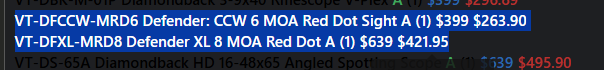 This excel appears to have errors. For example, it lists Defender CCW 6moa dot (VT-DFCCW-MRD6) as $249 regular price and $176 on sale.