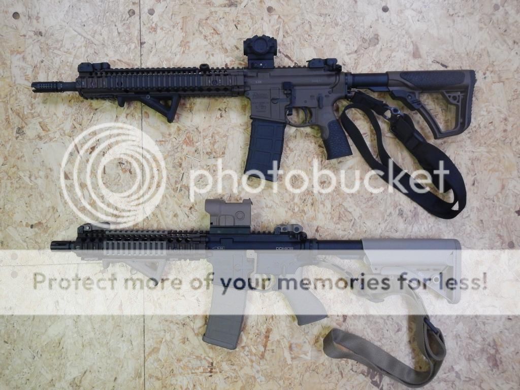 I'm waiting for a black B5 Sopmod stock and Tango Down BG17 grip for the 14.5", Surefire Scout lights or Inforce WML's for both (still undecided, using TLR-1s's atm), Geissele Tricon or SD3G for the MK18 (already using the Tricon in the M4A1 and a SDE on my 16", not sure which I'll go with yet), replacing both slings with Ares Armor or Frank Proctor ones if I can get my hands on them. I'll be replacing the Hensoldt RSA on the MK18 eventually with either an Elcan 1-4, Eotech XPS3, or Aimpoint T2/T1, and installing ambi safety selectors eventually, possibly with ambi charging handles. Still debating whether to stick with the DD birdcage style flash hider or go with something else (FSC556, M4SD w/ Blast Shield...) on the MK18 as well. A TD QD stubby grip may find its way onto both at some point too. I'd love to grab a DBAL or some other type of laser designator just for ####s and giggles one day but who knows they're pretty pricey if you don't need it.