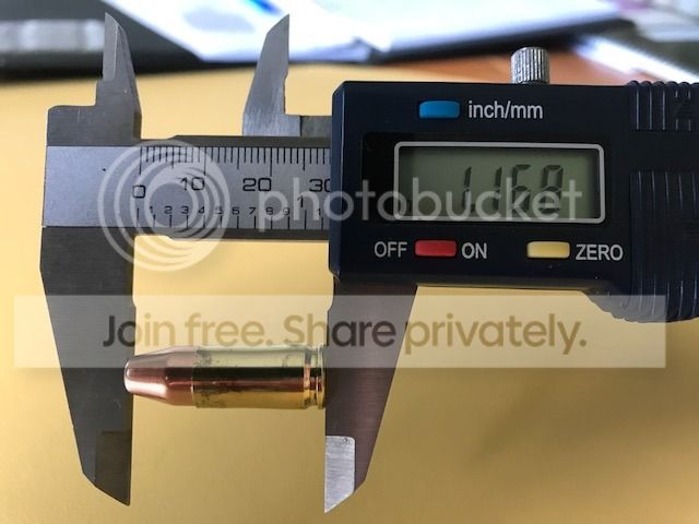Well I'm not quite ready for the 'f-ck it' method of reloading just yet, although after this mornings frustration I'm not far off...Spent a couple of wasted hours trying to get the Dillon Seating Die to give me something close to 1.160" and this is pretty much what I would have to settle for if there is no solution other than the above mentioned method...