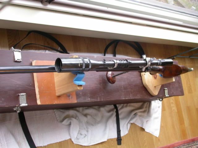 This shows the Unertyl 12X scope in the target mounts. On top of the barrell, just below the right end of the scope recoil spring, can be seen what appears to be an open sight; it is not an open sight but a level. At 200 yds. with the rainbow trajectory, a canted rifle would throw the slug well off the aim point, thus the need for level. This was not so important with the scope because a cant could be seen but was necessary if using the iron sights.