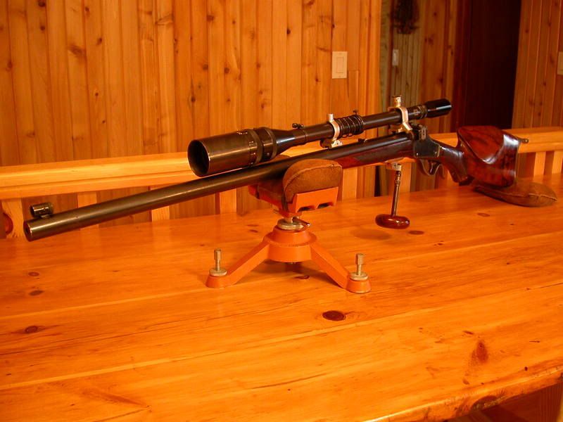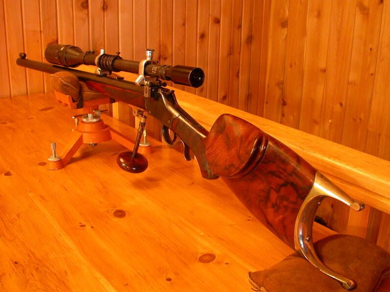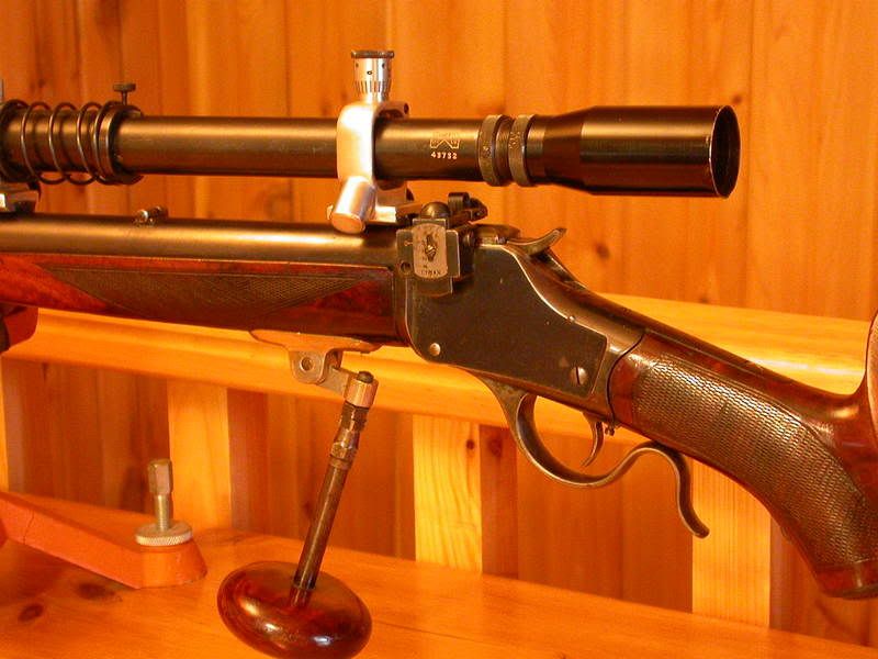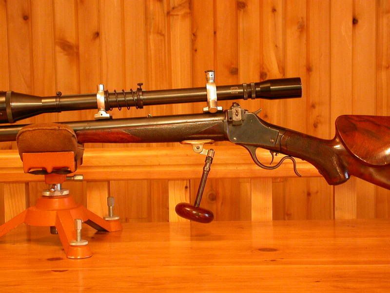 It's a #4 barrelled Hi-Wall, .38-55 which I bought in the mid 50's from Jack Sullivan of Bothwell, Ont. Originally, it was a straight but-stock but I had the long gone Charlie Parkinson of London, Ont. fit both Schutzen stocks (also obtained from Sullivan), the forend sporting a folding palm rest. Such modifications were routinely done in those bad old bubba days.