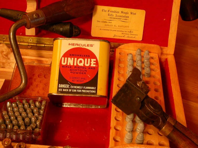 If my memory is correct, I was shooting about 14 grains of 4759 with a 275 grain lead bullet, lots of grease grooves. For this stye of shooting, velocity had to be kept in the 1,000 -1,200 FPS, no matter the rainbow trajectory, accuracy was the goal. We all on our benches set up a Lyman Powder measure or the equivalant, and used only a single case for the entire shoot, recapping, repriming, dropping the load, adding a pleget of kapok, tapped down with a lead pencil to ensure that the powder stayed down tight to the primer, seat a bullet which had been hand lubed at home, seated the bullet with the offset tool made from an old hand brace, with a cartridge cased screwed to it end. Thus the bullet was seated exactly to the same depth in the throat each time. The offset was to avoid the scope ocular, if you were flush enough to have one, close the chamber, set the trigger, rest the rifle, take aim and bang.
