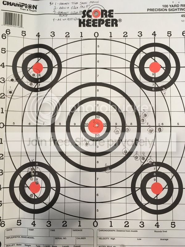 Well, they're better than 55gr is all I can say. At least they stayed on the map. I didn't bother with the AE 62gr, as all the others are consistently in the 4"-5" range. As usual the 75gr in the left upper and lower corners were within 2", so I guess there's really no point in trying anything else. From here on out it's all practice and more practice, as the limiting factor is definitely going to be me, not the rifle and/or ammo.